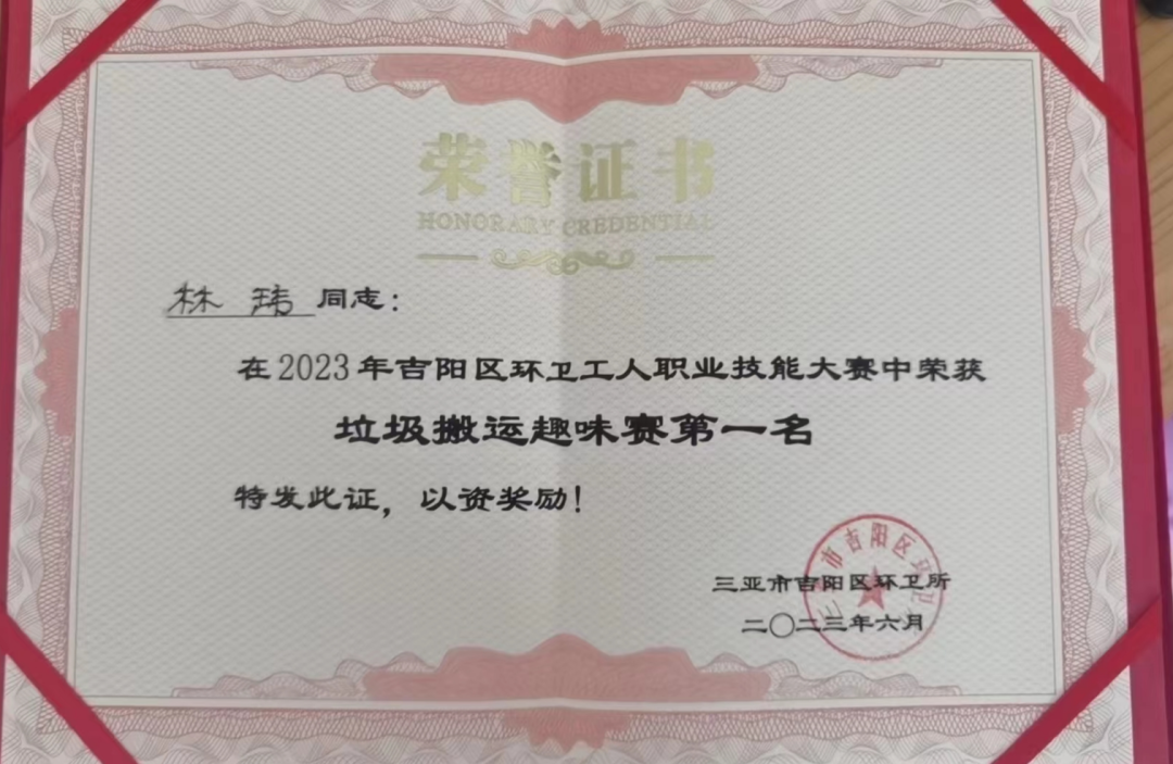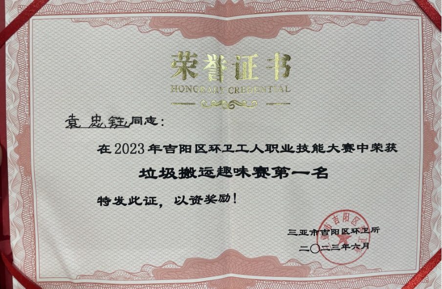 為推動吉陽區(qū)環(huán)衛(wèi)保潔質量,進一步提高一線環(huán)衛(wèi)工人崗位技能素質,培養(yǎng)技術技能型人才,激發(fā)廣大環(huán)衛(wèi)工人學習技術、專研業(yè)務、熱愛環(huán)衛(wèi)事業(yè)。2023年06月08日上午,三亞市吉陽區(qū)環(huán)衛(wèi)所組辦了2023年度吉陽區(qū)環(huán)衛(wèi)工人職業(yè)技能大賽,我司工作人員林瑋、袁忠鈺、梁青妹、符亞認、胡亞來代表公司參加此次活動比賽,并獲得垃圾搬運趣味賽一等獎、優(yōu)秀組織獎。