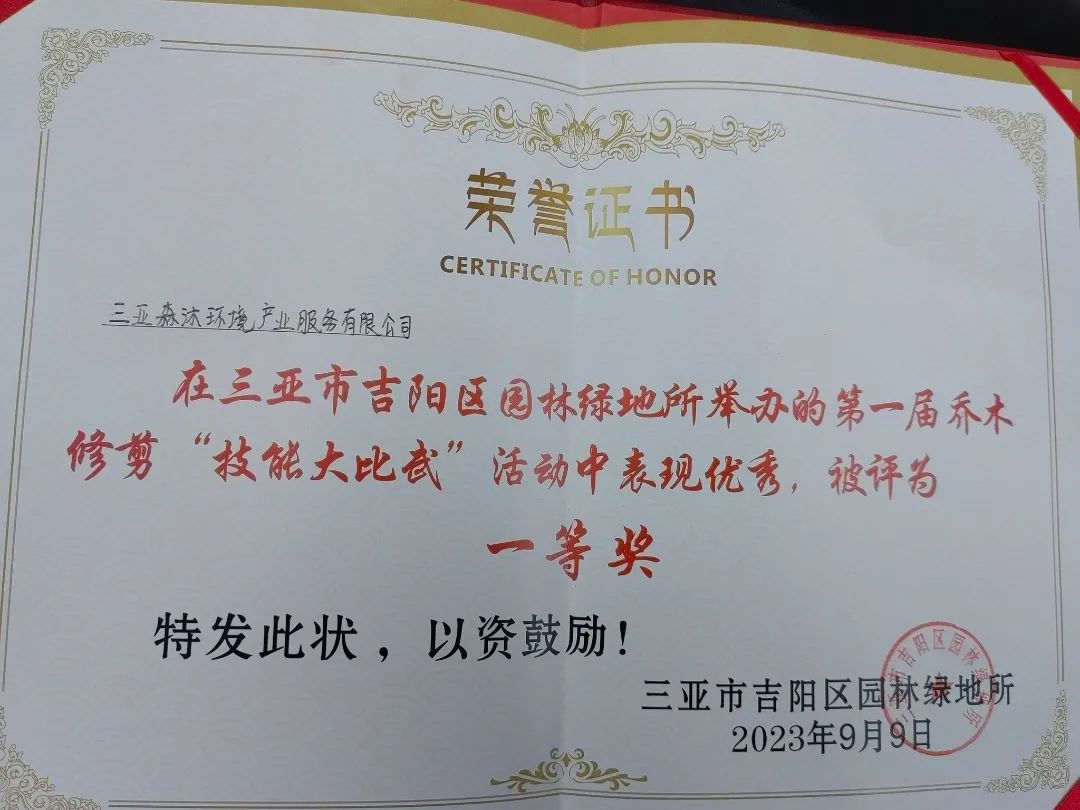 【喜報(bào)】森沐環(huán)境在三亞市吉陽區(qū)園林綠地所舉辦的第一屆喬木修剪“技能大比武”活動(dòng)中獲得一等獎(jiǎng)